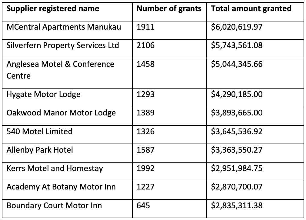 New figures released to National show the ten highest-paid emergency housing providers – a mix of hotels, motels and motor lodges – were paid more than $40 million in grants in 2020.