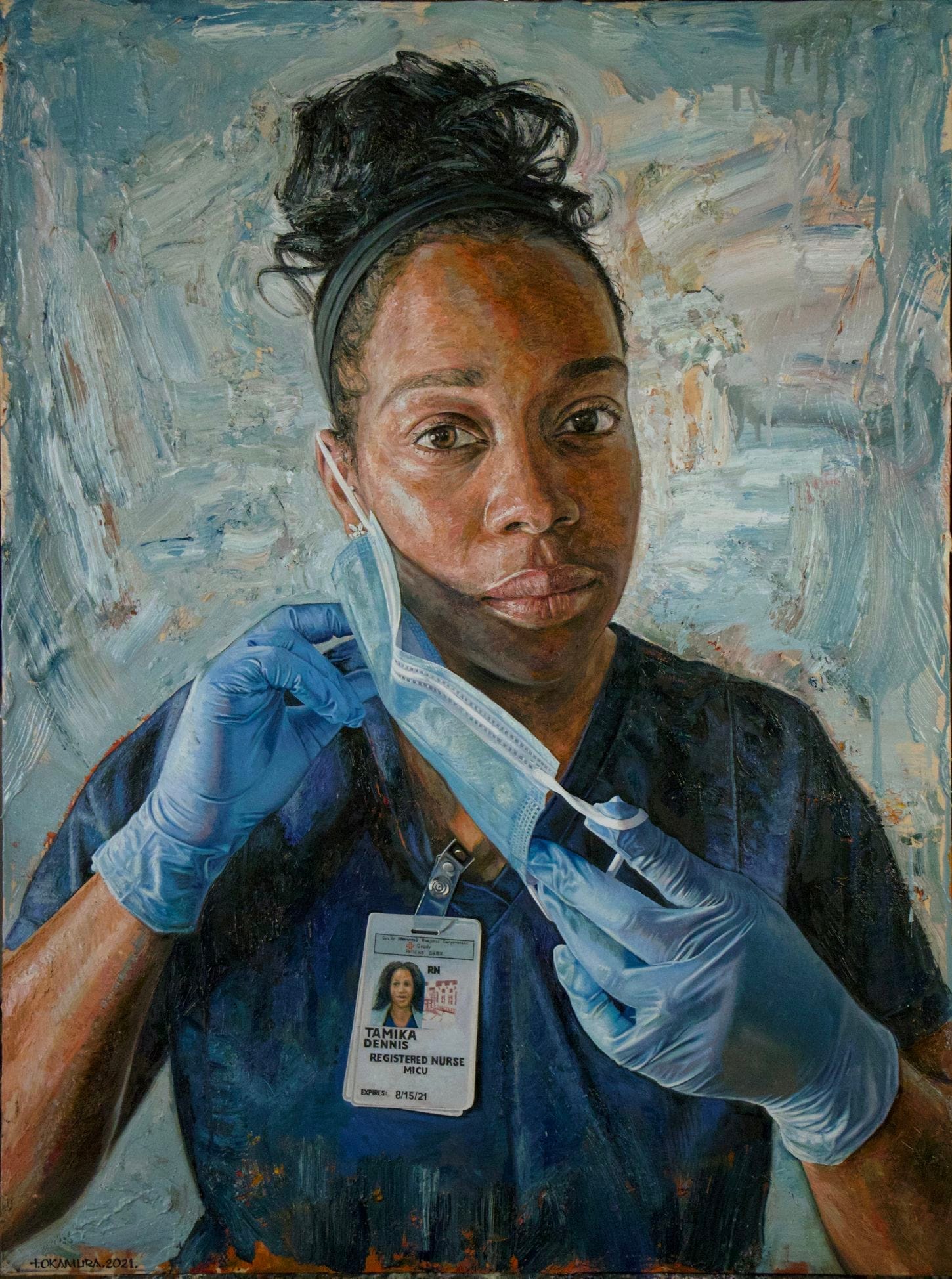Out of that we then can serve in all humility, just like the nurse painting in our work of art by Tim Okamura. Tim is a Canadian artist generally depicting African-American portraits in urban settings. His graffiti-like painterly style adds grittiness to his works.