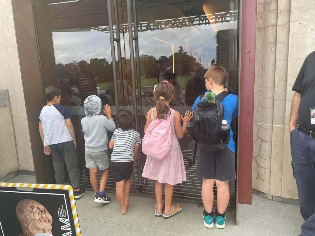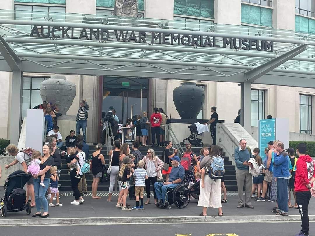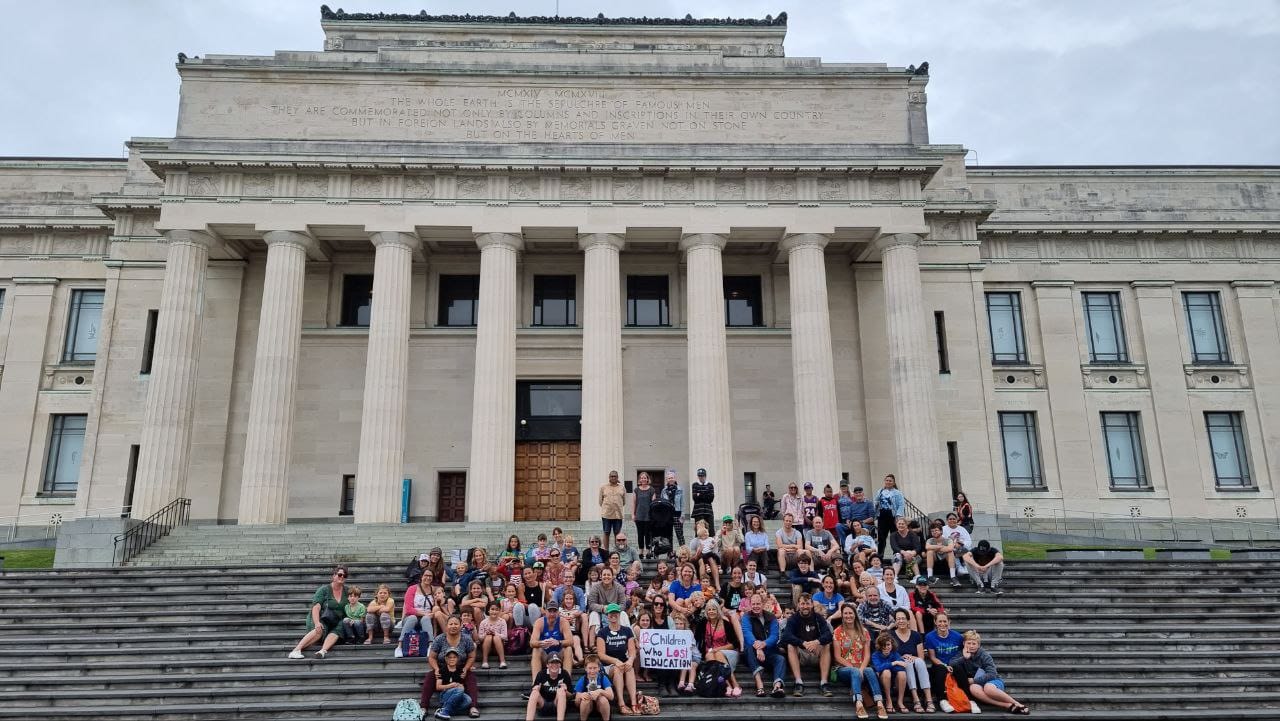 A group of mostly homeschooled children and their parents met to visit the Auckland Museum on the first day the vax pass dropped.