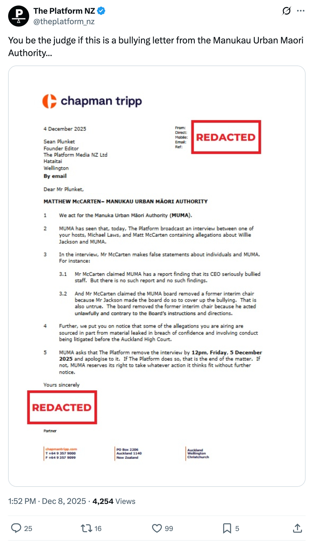 Now the plot thickens: High-powered law firm Chapman Tripp, no doubt on a fat retainer from the taxpayer-funded MUMA, fired off a bullying letter and email to the Platform after Michael Laws interviewed Matt McCarten on 4 December. That interview followed my podcast breaking the story the day before. The letter, dated 4 December 2025, demands the Platform yank the interview by noon on 5 December and apologise, or else face the wrath of the Auckland High Court. It claims McCarten spouted “false statements” and insists there is “no such report” finding that Rangiheuea seriously bullied staff, “no such findings” and that the board sacked the former interim chair because he acted “unlawfully and contrary to the board’s instructions”. You can see the letter for yourself in the image below – it is classic bully-boy tactics from lawyers who think they can shut down free speech with threats.
