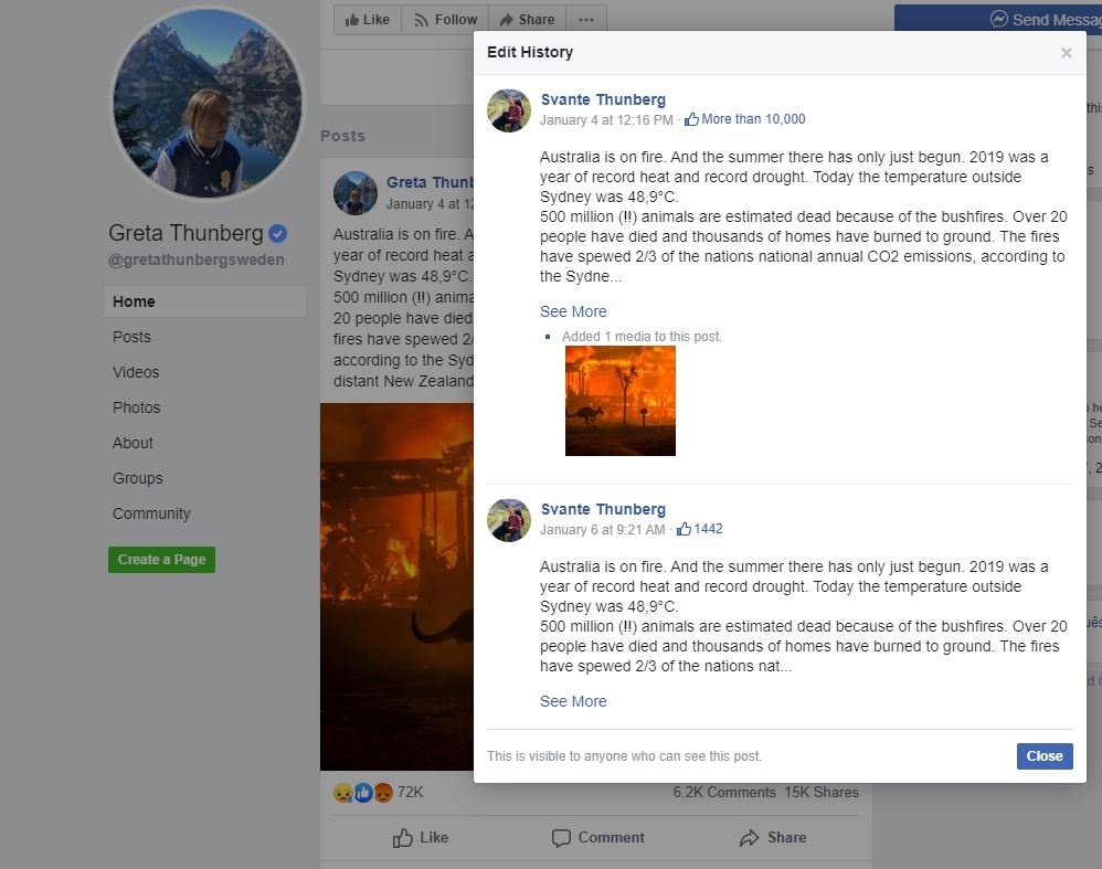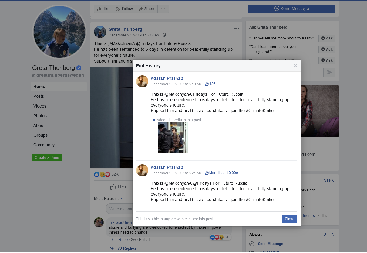 A Facebook glitch which allowed visitors to view the edit history of user’s posts has been rapidly fixed, but not before tech-hounds managed to exploit and explore several high-profile user pages, including Miss Thunberg.