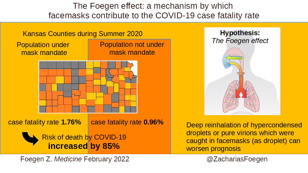 Dr Foegen offers a hypothesis for a biological process that might explain why CFRs increase when mask mandates are imposed. He named this process the Foegen Effect because he found no prior literature describing it. He illustrates the effect as being comparable to the visible misting (with exhalation) and de-misting (with inhalation) when a face mask is placed over the lower edge of the wearer’s eye glasses.