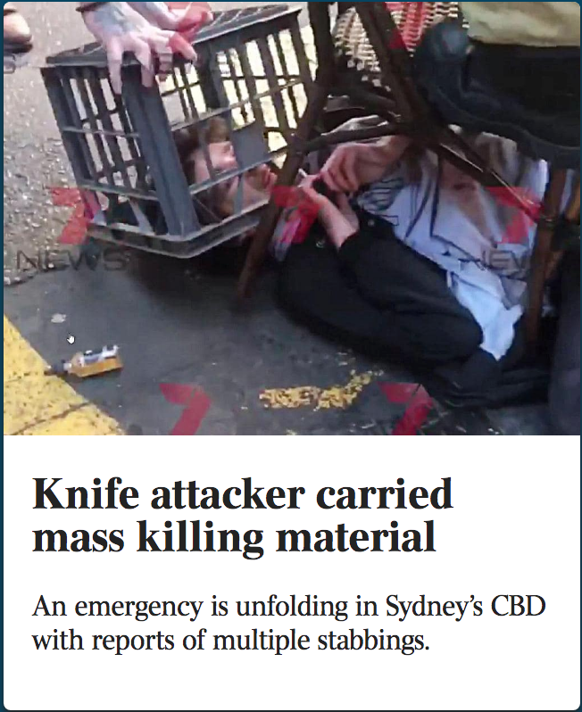 The last time an Aussie stopped a ‘knife attacker’ the hero of the day was a homeless man who used his shopping trolley. Who needs guns when you have brave Aussies armed with milk crates, wicker chairs and shopping trolleys?