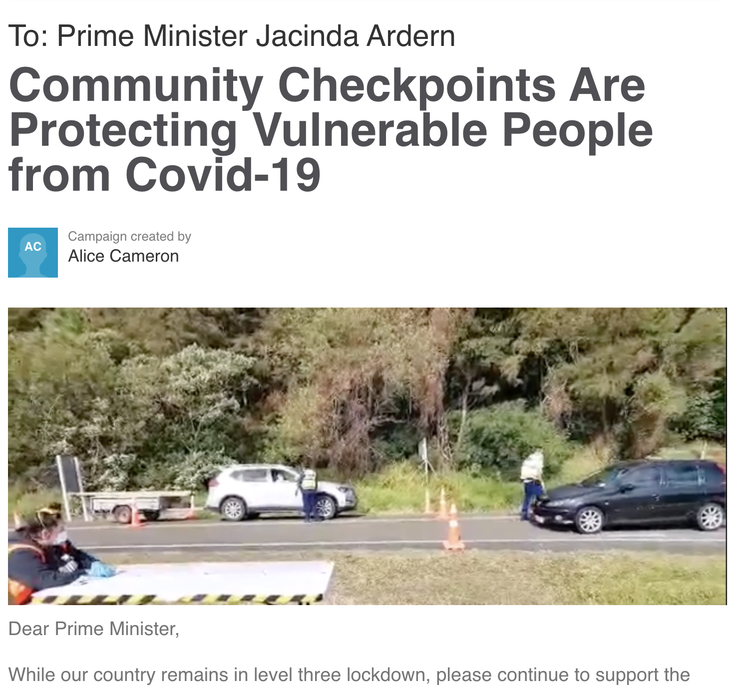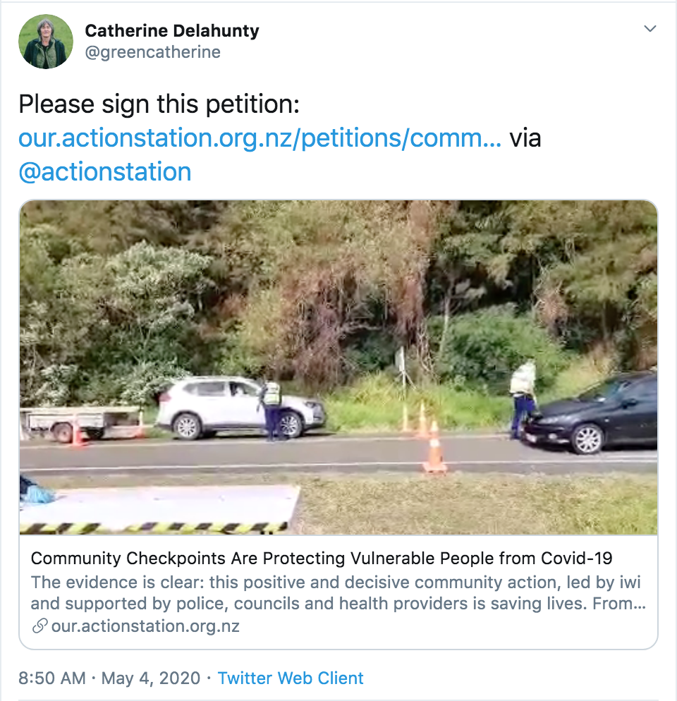 - She promotes a petition asking the PM to continue to allow illegal checkpoints run by iwi.