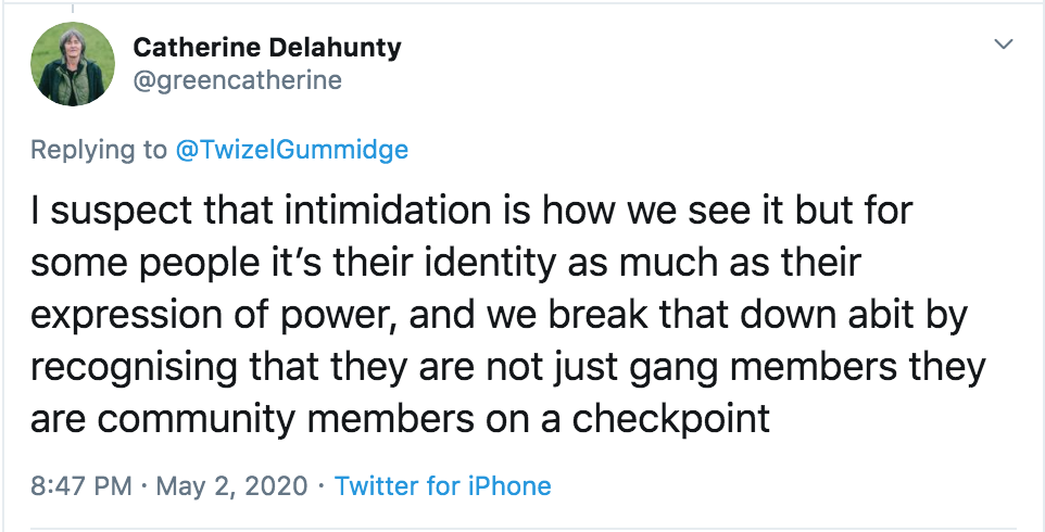 3. She is an apologist for gangs and their wearing of gang patches to intimidate the public.