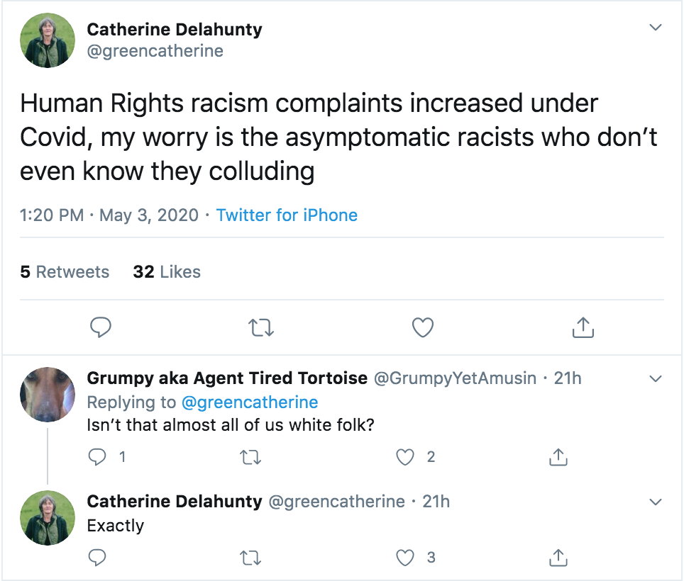 Today’s face of the day, former Green MP Catherine Delahunty, is tone-deaf to her own racism. She happily diagnoses it in others but fails to see the log in her own eye.