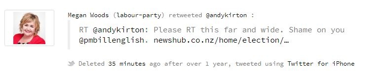 Megan Woods deleted a tweet today that she tweeted over 1 year ago. The tweet referred to a NewsHub article about Bill English saying a Labour Govt will increase taxes on income.