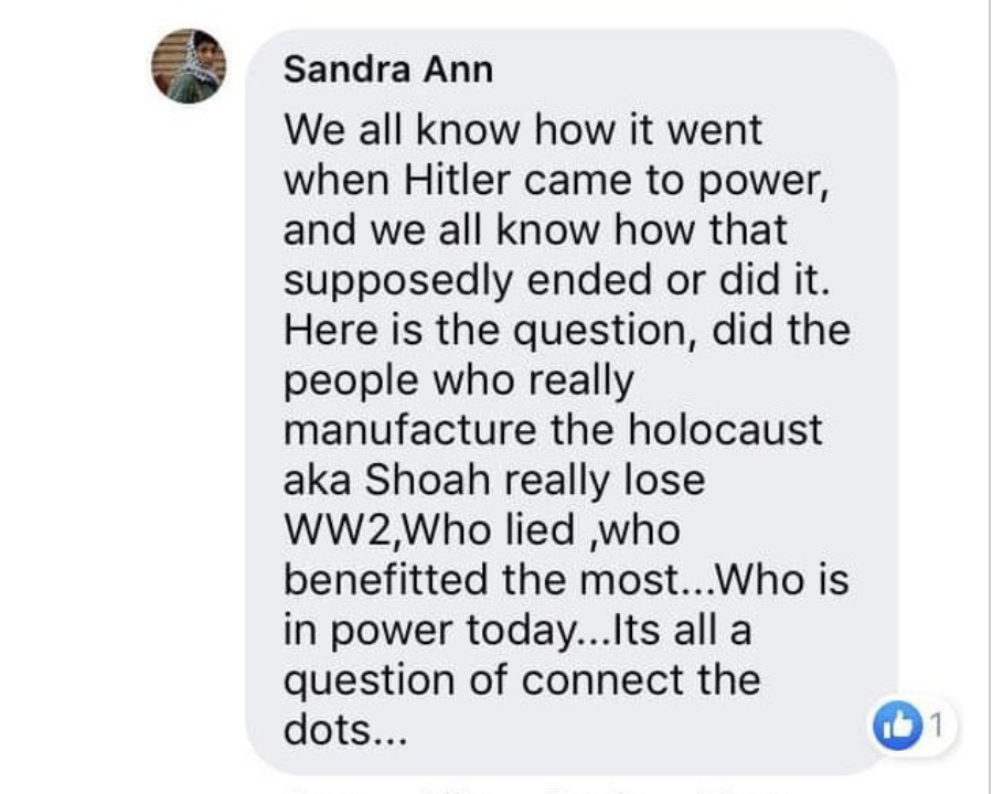 Sandra Ann is a Holocaust denier among other things and an Admin of the Facebook group “Aotearoa Standing with Palestine”