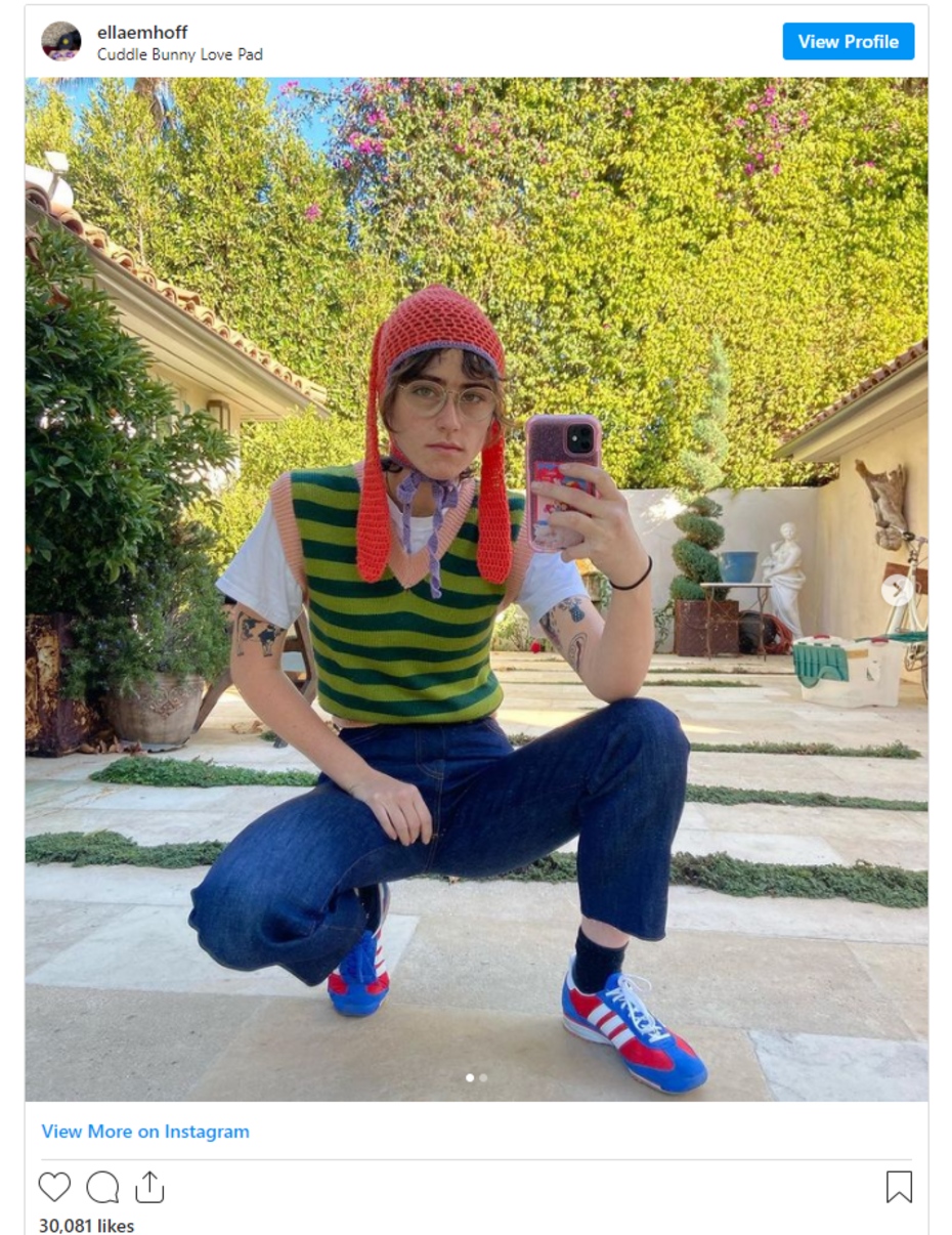 Ms. Emhoff throws a crocheted grenade at the image of typical D.C. political offspring, with a style that could be termed Wes Anderson chic. In her selfies, she doesn’t wear much makeup and doesn’t carefully blow-dry her naturally curly hair. She shows off her armpit hair and cartoonish tattoos, which include eggs and bacon in the shape of a smiley face and a cow.