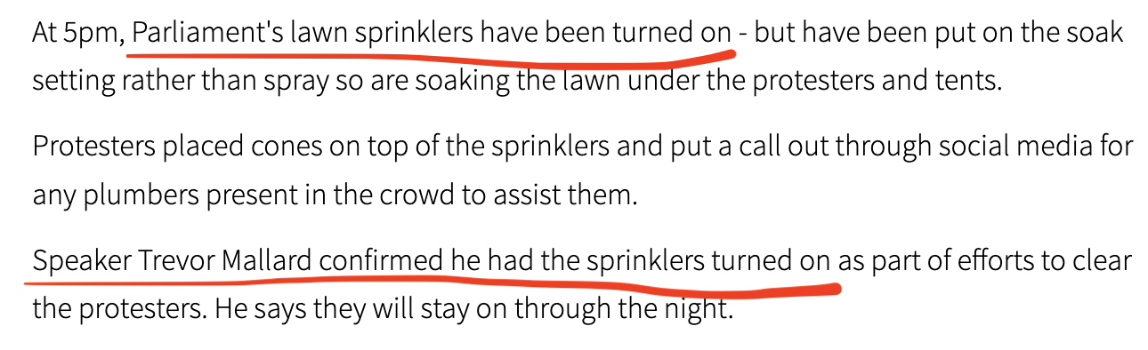 Trevor Mallard is trying to wash the protesters of the Parliament lawn, but they’re diverting the sprinkler water. Number of people growing, too: pic.twitter.com/f2MufNSSYH
