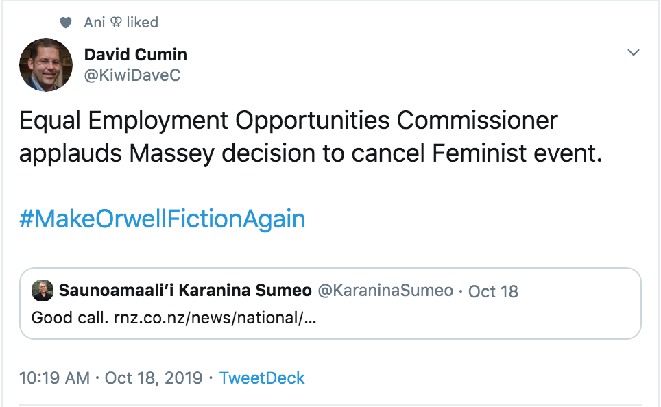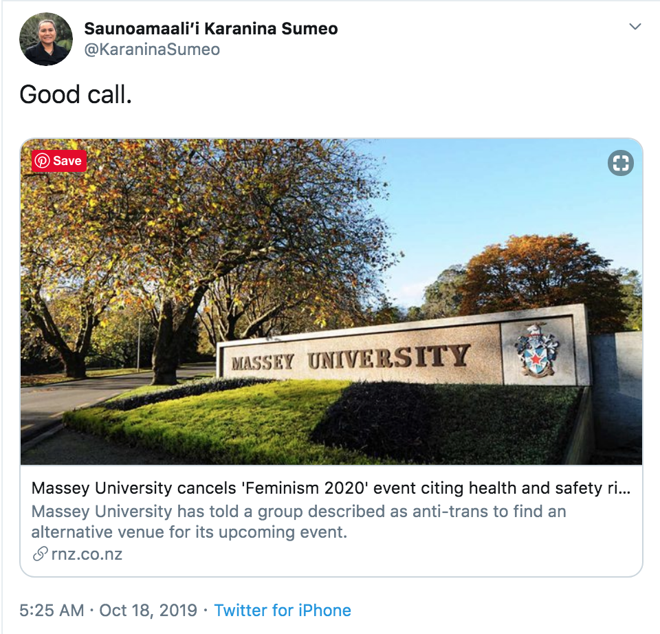 Today’s face of the day Saunoamaali’i Dr Karanina Sumeo is a very strange Equal Employment Opportunities Commissioner, as she doesn’t support equal access to free speech. In fact, she supports feminists being de-platformed from Massey University describing it as a “Good call.”