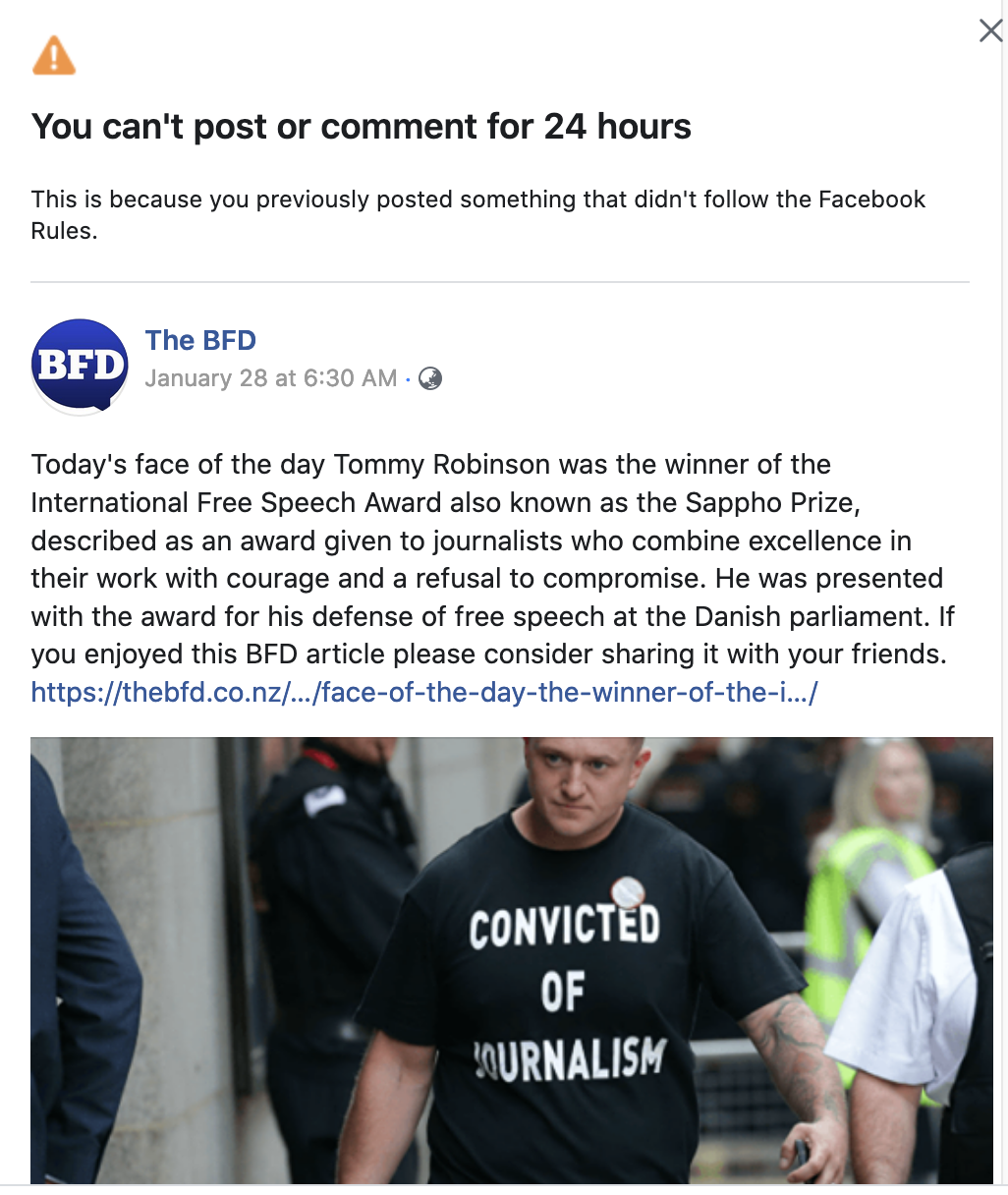 How messed up is this dear readers? Our article about Tommy Robinson a man who won an International Free speech award is censored by Facebook because Facebook considers him ( and by extension Free speech) to be dangerous!