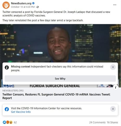 In addition to censoring Salgado’s account, Facebook censored four other MRC accounts in connection with the Florida Department of Health study, including NewsBusters, Free Speech America, CNSNews, and MRC’s main account.