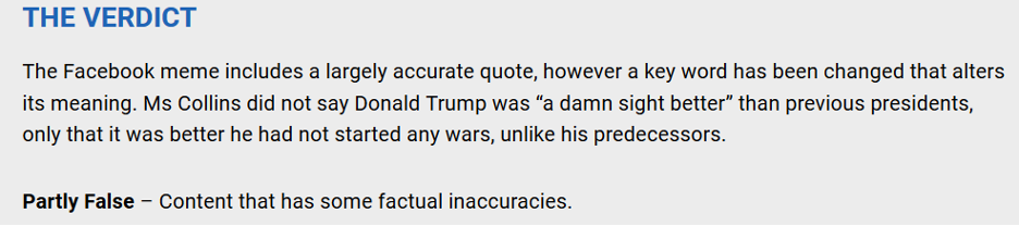 Beggaring belief: FactCheck claim that since the edited quote employed in the meme used words that Ms Collins used, it is largely accurate, just as a photocopy of a $10 note is largely accurate, but still a shallow and worthless counterfeit – it is not merely a note containing ‘some inaccuracies’ – it is fraudulent.