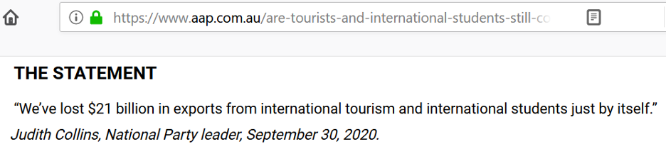 Nevertheless, says FactCheck, although the tourism and international-student sector did indeed represent $21.1B in contributions to export earning, that income stream “had not evaporated in its entirety” because some students were still in the country, and that remainder contributed approximately $1.76B to the economy post-lockdown. On that basis Collins’s claim was awarded the “False” label, being only 92% correct, or 8% wide of the mark, depending on whose shoes you fill. Crikey, I thought, that’s a high bar for false-hood.