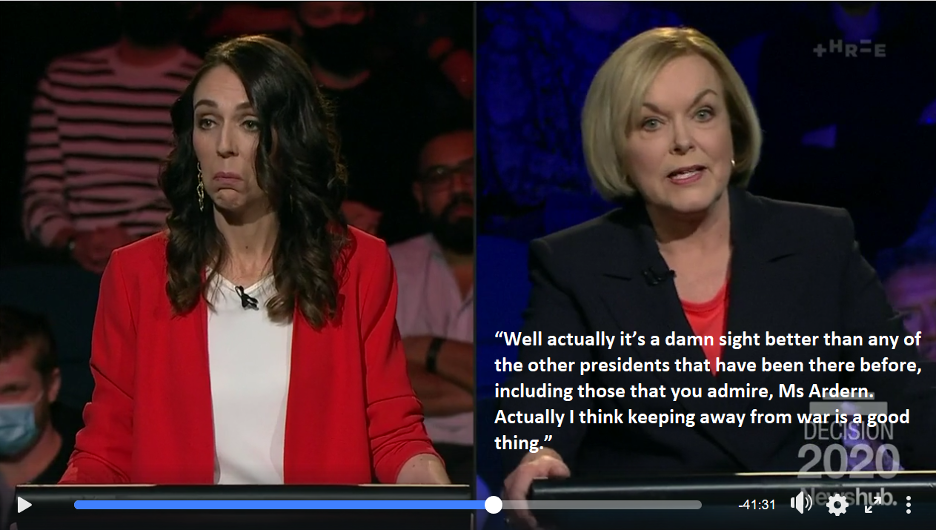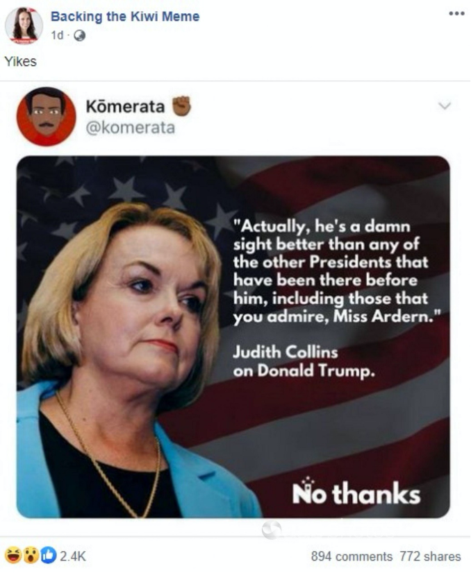 Under the headline “Manipulated Collins quote misrepresents praise for Trump” FactCheck helpfully pointed out that Ms Collins was clearly referring to the American president’s aversion for military interventions, a clear and present fact, and a stance for which it has been suggested he receive the Nobel Prize for Peace. FactCheck also pointed out that the meme author had intentionally altered the leader of the opposition’s words. Perhaps the meme author was encouraged by the arguably juvenile but definitely very un-prime-ministerial, face-pulling by Ardern as Ms Collins delivered her chastising retort: