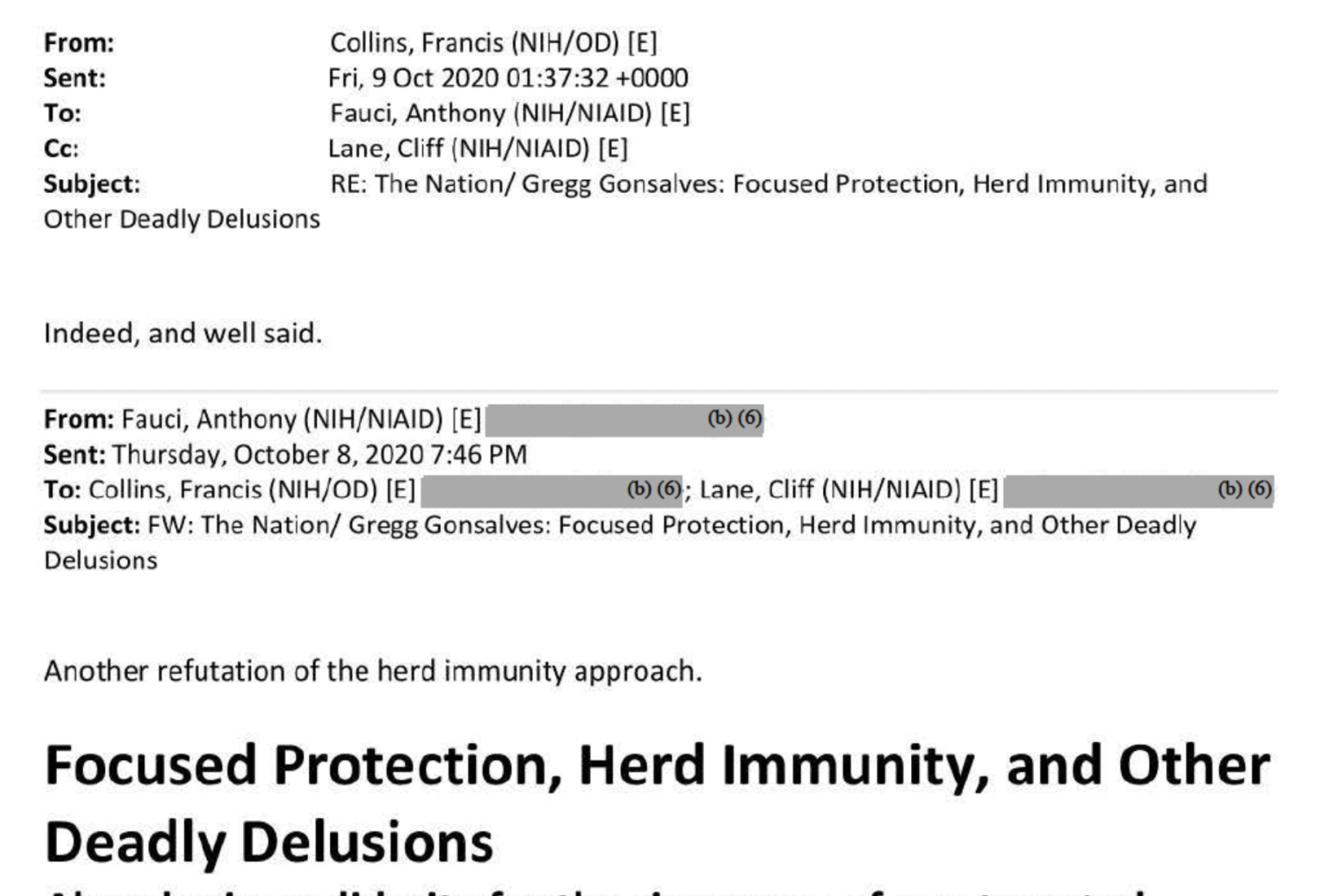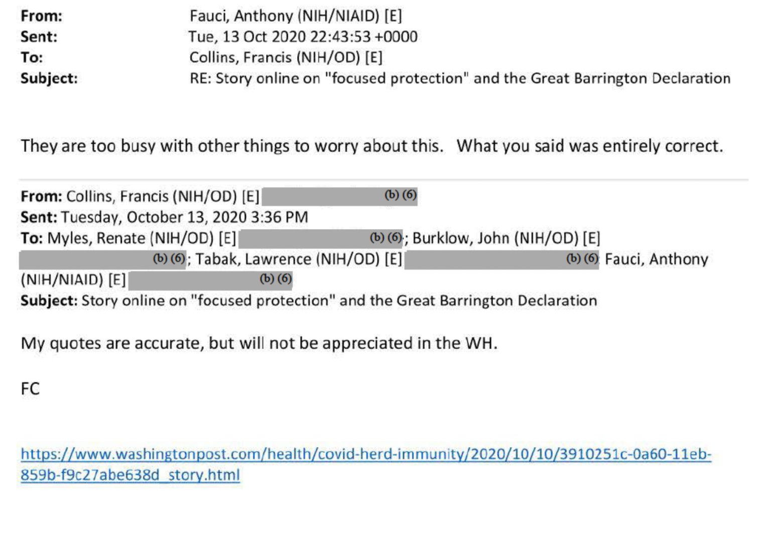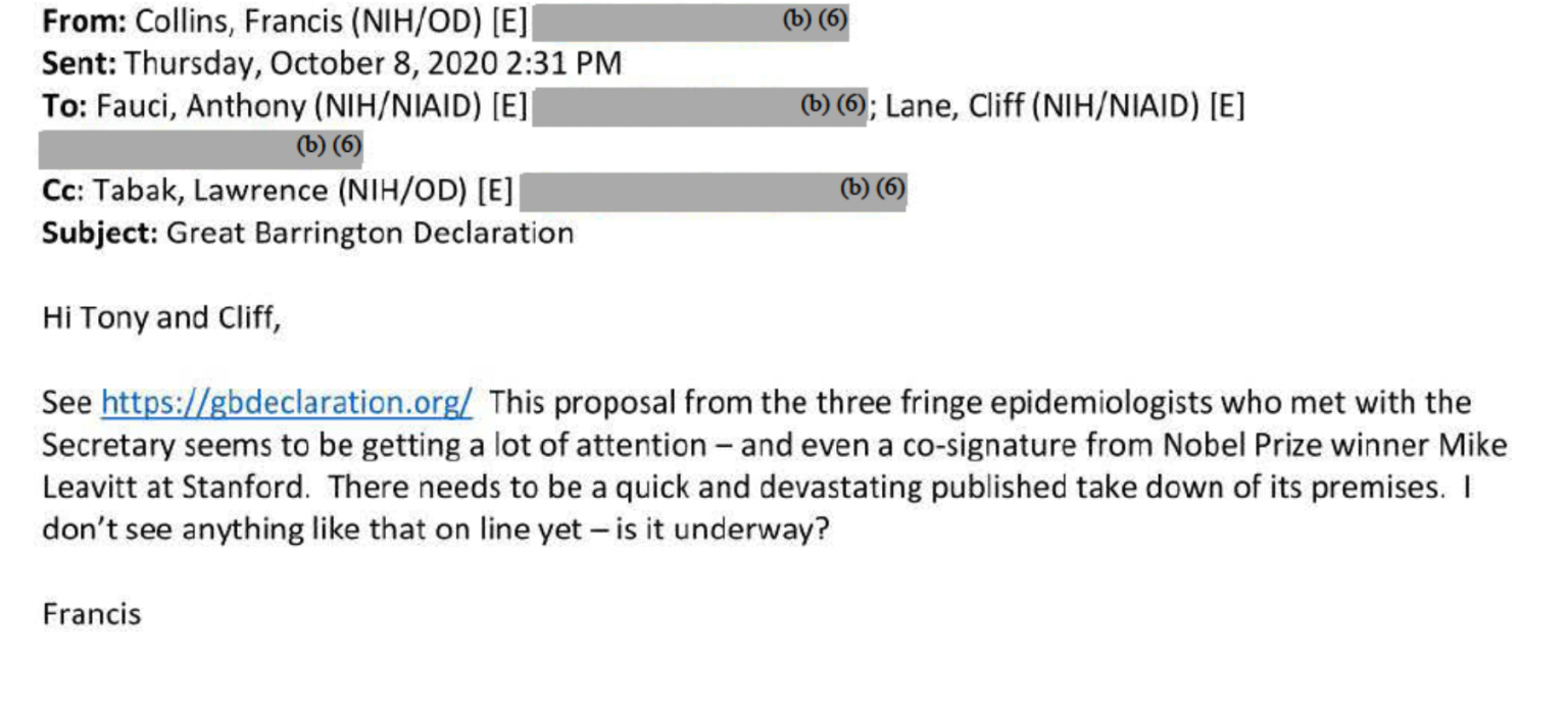 The author of the initial email is Francis Collins, director of the National Institutes of Health. The recipients were Anthony Fauci and H. Clifford Lane, NIAID Deputy Director for Clinical Research and Special Projects.The email calls for a “published take down” of the GBD that is both “quick and devastating.”