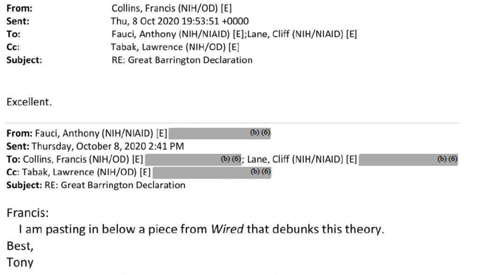That evening, Fauci wrote back, not with a reference to any scientific papers supporting lockdowns and so on but with a piece from the gadget publication called Wired, which said the GBD is wrong because “quite literally arguing with the past” because the lockdowns are no longer being used. Collins responded: “excellent.”