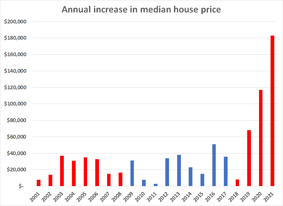 This chart above shows the annual increase in the median house price for every year since 2000. Note the 2021 figure is for June 20 to June 21; the rest are calendar years.