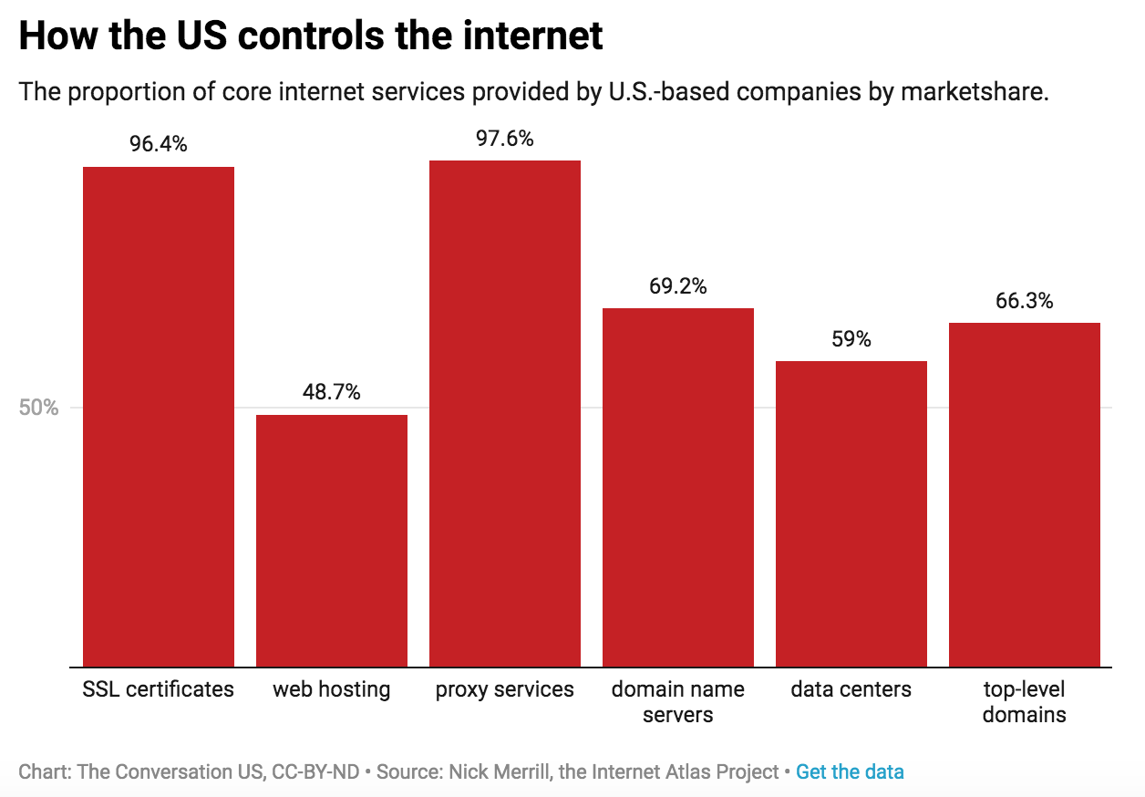 Since at least 2015, the core services that power the internet have become increasingly centralized in the hands of U.S. corporations. We estimate that U.S. corporations, nonprofits and government agencies could block a cumulative 96% of content on the global internet in some capacity.