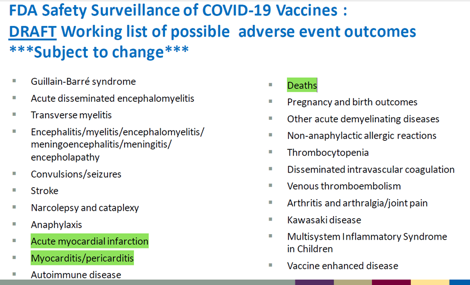 The Pfizer injection was not a normal ‘vaccine’, instead using gene technology to turn the human body into a spike protein factory. During its development, it was expected that events including cardiac arrest and death might be adverse effects. The following slide is taken from an Oct 2020 presentation discussing vaccine safety monitoring.