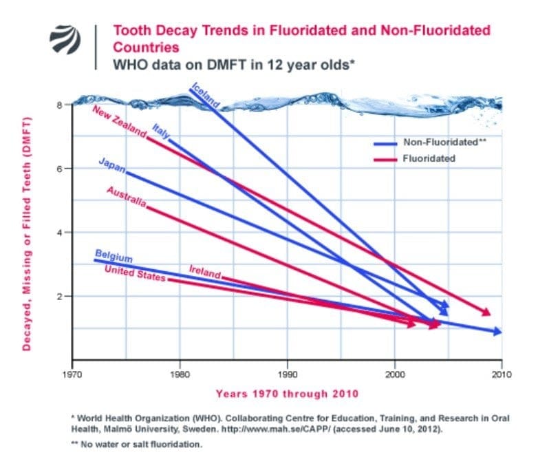 Although rates of tooth decay have in fact precipitously declined across western nations in the past 50 years despite most Western nations not fluoridating their water, a wealth of research appears to confirm that water fluoridation reduces decayed, missing and filled teeth (DMFT) in populations. Most research supporting water fluoridation to prevent dental caries appears to ignore the World Health Organization data showing no difference in DMFT rates at 12 years old between places with and without water fluoridation.