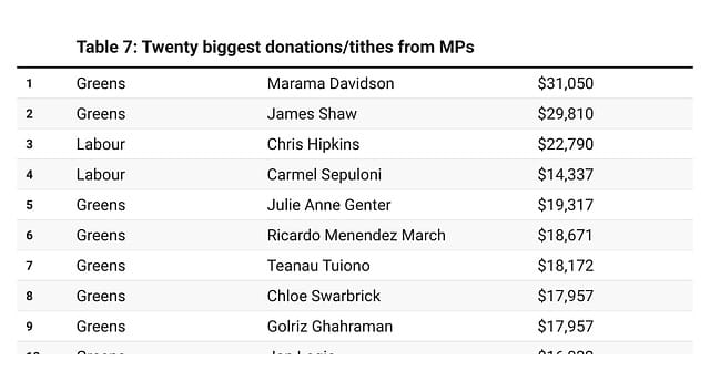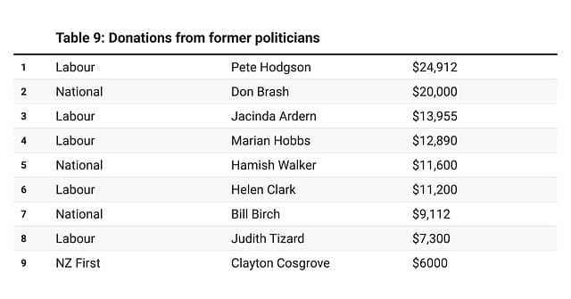 It’s normal for political parties to seek extra fundraising from former MPs, especially those in retirement who might have accumulated decent fortunes from their time in politics and afterwards. While the example in the table below of Clayton Cosgrove’s consultancy firm giving $6000 to NZ First is the smallest, it’s possibly the most interesting, given that Cosgrove is a retired Labour MP.