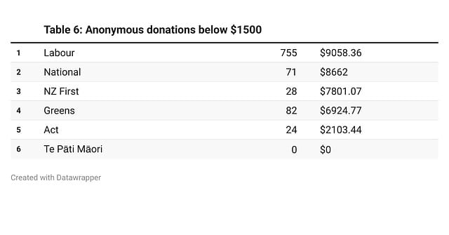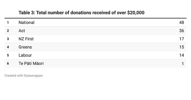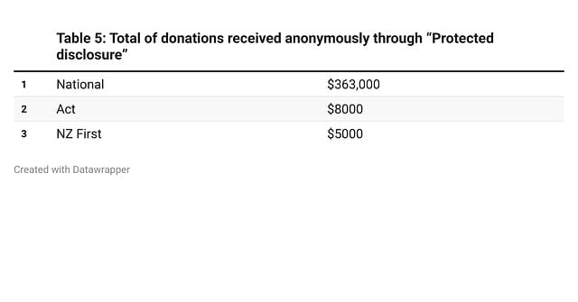 In 2023, there were only eight such donations, six of which went to National, totalling $363,000 (just below the allowable limit). NZ First and Act received one protected donation each. This information can be seen in the table below.