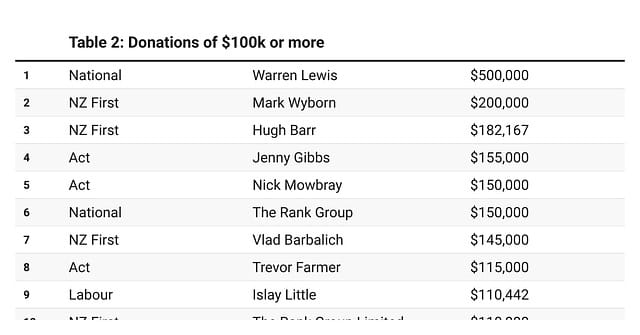 The 2023 election year certainly contained quite a few huge donations from wealthy individuals and companies. By far the biggest was the $500,000 donated to National by business owner Warren Lewis. Although this has been reported to be the largest recorded donation given to a political party, back in 2005, businessman Owen Glenn infamously gave $500,000 to the Labour Party.
