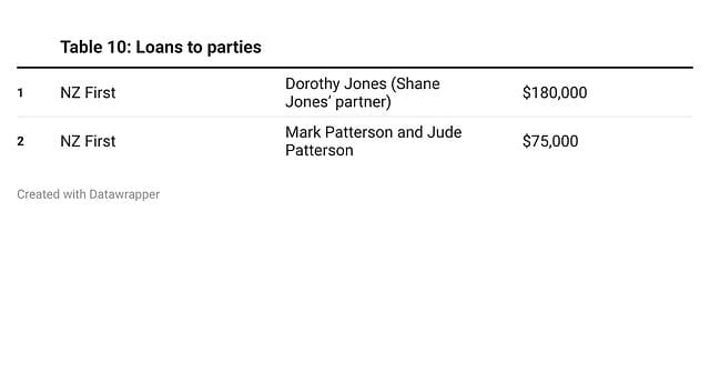 Although donations to parties have been regulated for decades, the loans provided to politicians have often flown under the radar, even though such loans have in the past been written off. Loans can often turn into donations, so they are now required to be disclosed. But in 2023, only two loans were disclosed, and they were both given to the NZ First party from the families of candidates—see the table below.