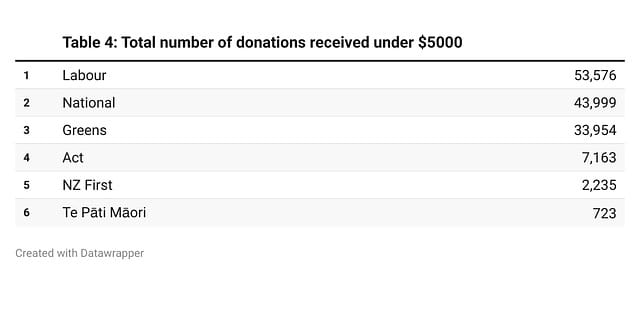Furthermore, parties also now have to report on the quantum of donations received that are below the declaration threshold. For 2023, National has declared about $6m of below-$5000 donations. The larger donations only make up about $4m, or about 40 per cent, of National’s declaration.