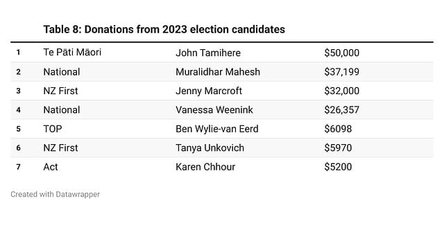 The most prominent example in the table below is the $50,000 given to Te Pati M?ori by list candidate John Tamihere, however in his case, he’s also the President of the party. Just as Tamihere didn’t make it into Parliament, National’s Auckland Central candidate Muralidhar Mahesh – who donated $37,199 – also missed out, along with TOP donor-candidate Ben Wylie-van Eerd ($6098). More successful were Jenny Marcroft ($32,000) for NZ First, Vanessa Weenink ($26,357) for National, Tanya Unkovich ($5970), and Karen Chhour ($5200) for Act.