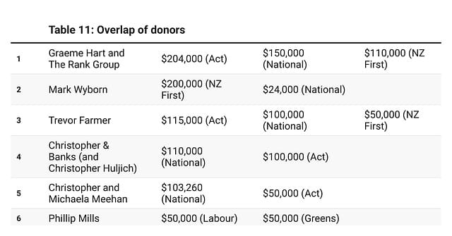 Several donors have given to more than one political party. Clearly, some donors wish to support many different parties on the same side of the political spectrum. Hence, New Zealand’s richest man, Graeme Hart and his company The Rank Group, gave $204,000 to Act (in separate donations), $150,000 to National, and $110,000 to NZ First – all totalling $464,000.