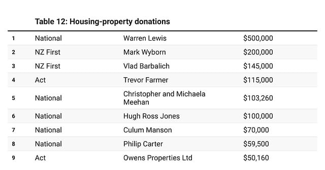 Various property developers have made some large donations. For example, Mark Wyborn has given $200,000 to NZ First and $24,000 to National. His business partner Trevor Farmer has given $115,000 to Act and $100,000 to National.