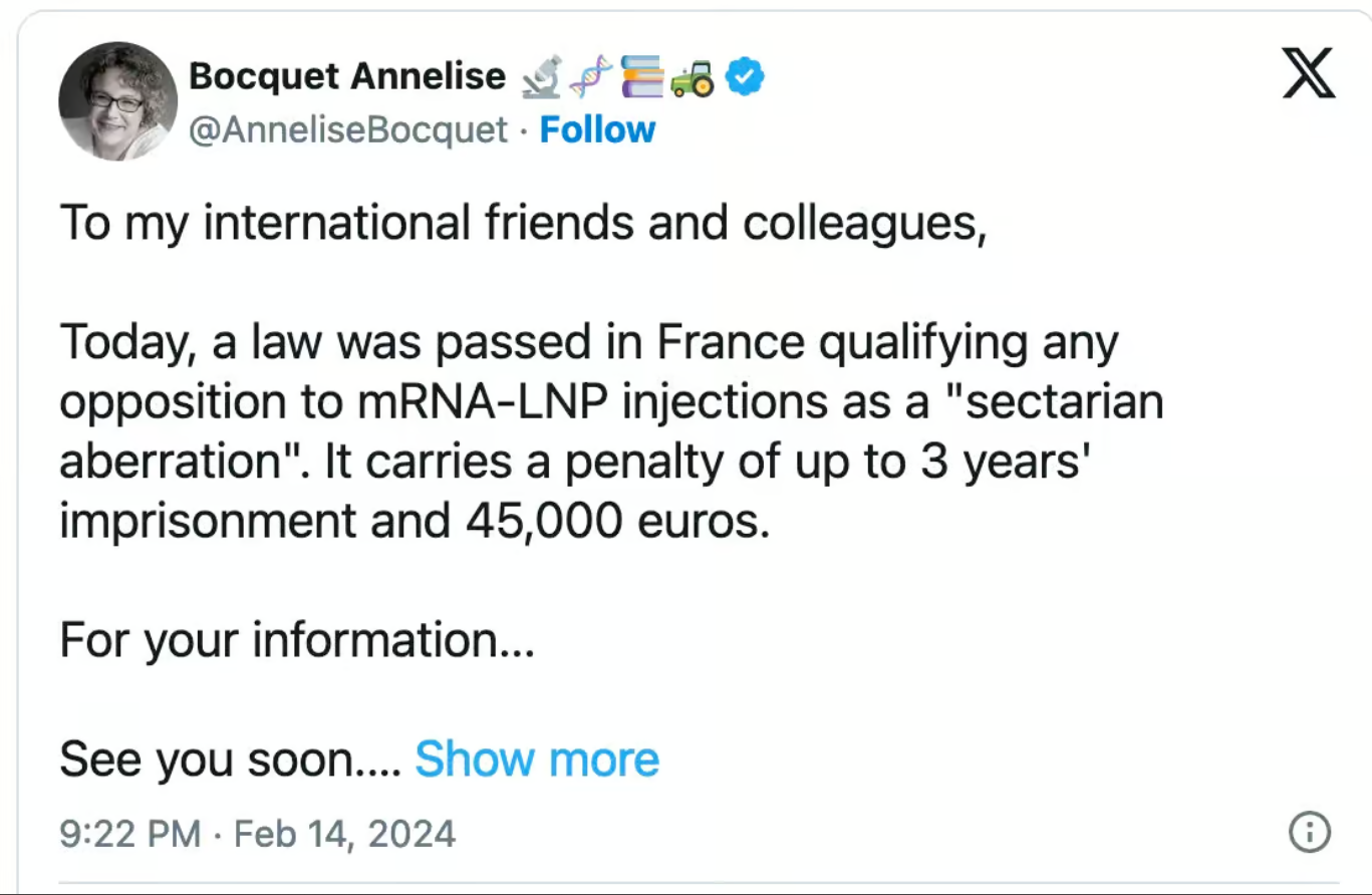 On Wednesday, February 14, a highly controversial law was pushed through the National Assembly in France, potentially turning a critic of mRNA treatment into a criminal. The draconian law, which was quietly passed with virtually no debate, could throw anyone who advises against the use of therapeutic or prophylactic treatment (including experimental mRNA gene therapy) into prison for up to three years and pay a hefty fine of 45,000 euros.