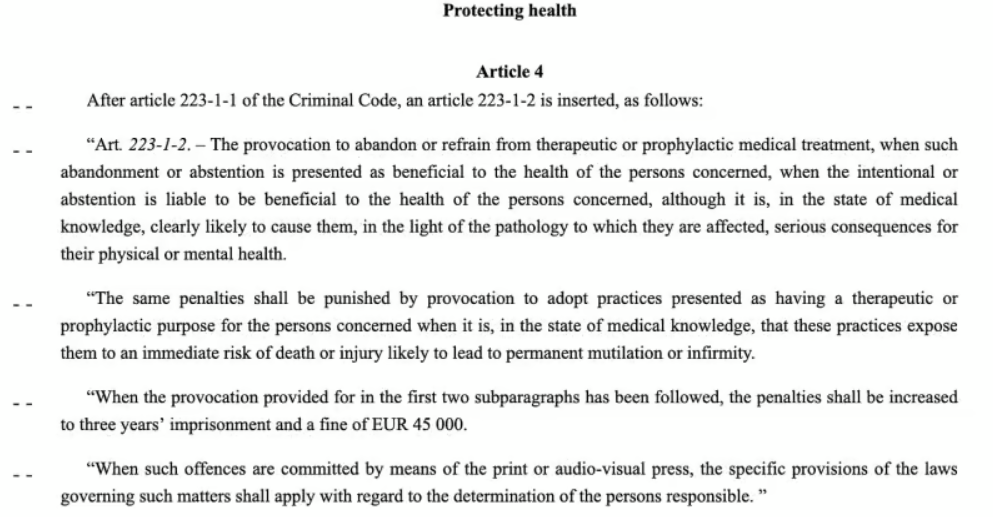 The bill was initially proposed in 2022 following a report from (Miviludes) the Interministerial Mission for Vigilance and Fight Against Sectarian Abuses. It is the inclusion of the creation of an offense to punish ‘provocation to abandonment or abstention of care’ that has sparked such fierce controversy.
