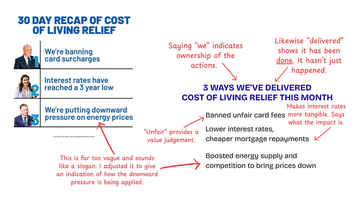 I have chosen one graphic (below) to demonstrate how they could improve the language they use to claim ownership of actions, position themselves as the good guys, and be less wishy-washy.