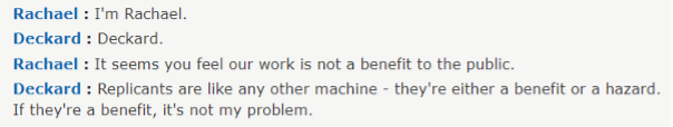 The Blade Runner is “Deckard”, played by Harrison Ford in one of his break-out roles. In the movie, as an avatar of a ‘bounty hunter character’ he visits an industrial tycoon called ‘Tyrell’, who has conglomerate interests, one of which is the creation of replicants, human simulacra with a limited lifespan, to be used as slaves. On arrival at the tycoon’s estate, he is greeted by “Rachael”, a beautiful woman. Together they discuss the work of the Tyrell Corporation and Deckard’s role in hunting down replicants who seek their freedom. They have the following exchange: