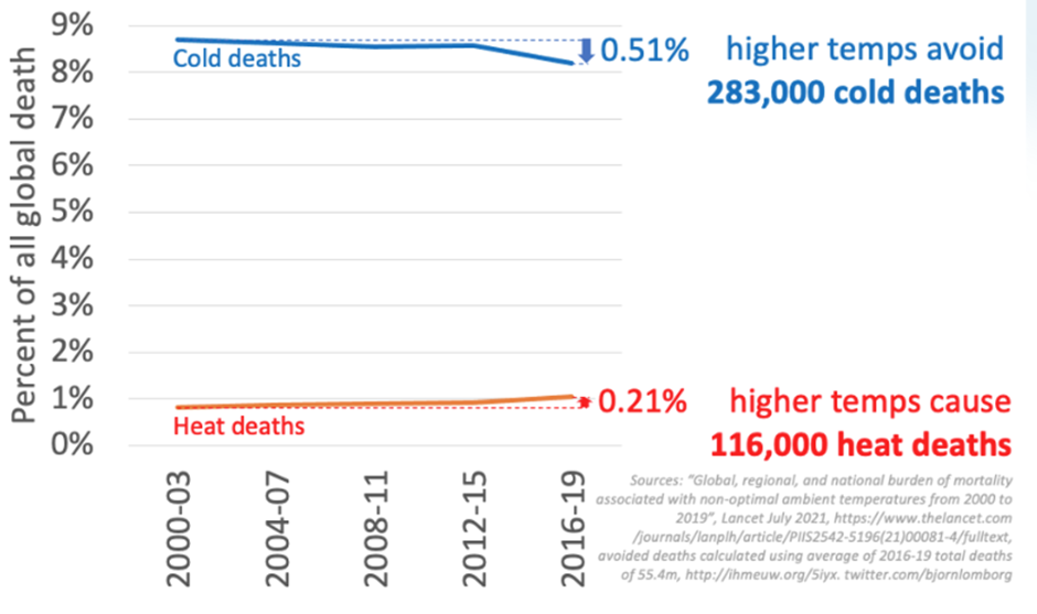 As a result of a temperature rise since 2000, we are now experiencing 166,000 fewer “temperature-related deaths” each year.This is a combination of over 116,000 fewer deaths due to heat and nearly 283,000 fewer deaths due to cold.