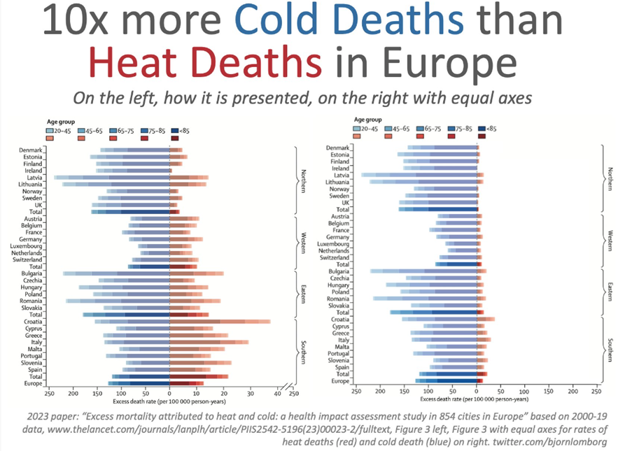 As evidence consider the following study and how the narrative is slanted: Gasparrini A, Guo Y, Sera F, et al. Excess mortality attributed to heat and cold: a health impact assessment study in 854 cities in Europe. Lancet Planetary Health, 2023; 7: e301–12.