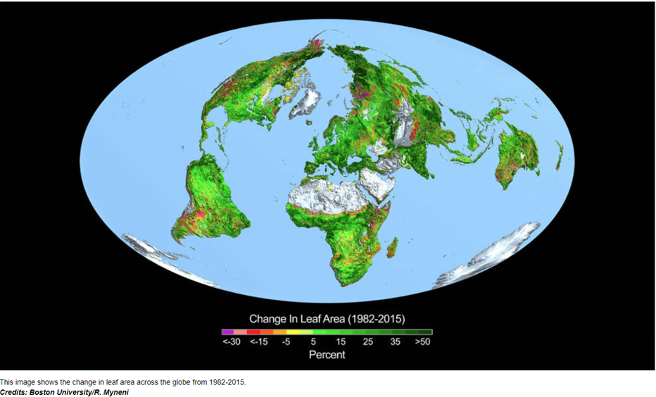 Take the “greening of the Earth” as another example. In a NASA study using satellite data to measure ‘leaf cover’ across the world’s vegetated regions, from 1982 to 2015, researchers noted significant changes. The image below depicts these alterations, with green representing growth and brown indicating decline. The study found that more than 25 per cent of Earth’s vegetated lands have seen substantial greening in the last 35 years. Carbon dioxide fertilisation is the primary driver, contributing to 70 per cent of the greening effect, while factors such as nitrogen, land cover changes and climate variations – like shifts in global temperature, precipitation and sunlight – also played a role.
