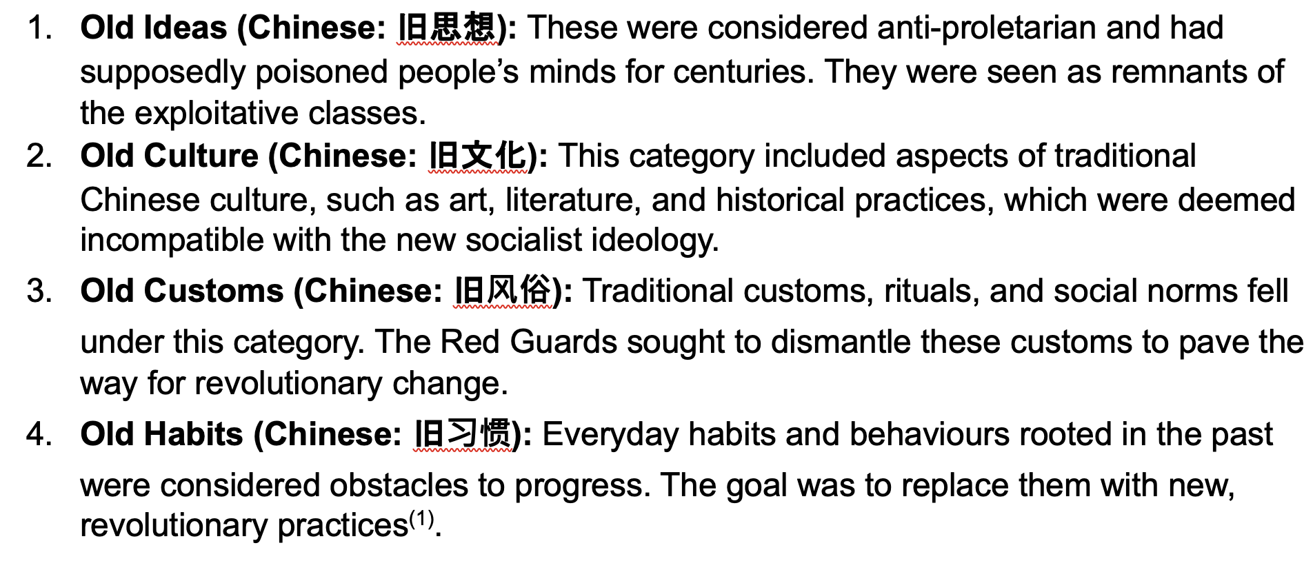 The campaign to destroy the “Four Olds” began in Beijing during the “Red August” of 1966, shortly after the launch of the Chinese Cultural Revolution. The specific elements constituting the “Four Olds” were never precisely defined (as an analogy we can consider “hate speech”), but their eradication was a central theme. Mao Zedong called upon his Red Guards, a militant youth movement (as an analogy we can consider the “woke” (e.g., Antifa), to eradicate the “Four Olds”. These “Four Olds” referred to pre-communist elements within traditional Chinese culture and were targeted for destruction. They included: