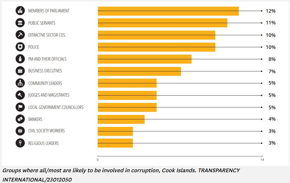 A recent report by Transparency International highlighted this. They conducted a survey of locals in 2023 and found that a significant minority of respondents believed that Cook Islands companies frequently used money to secure government contracts, and that the government was often run by a few big interests looking after themselves.