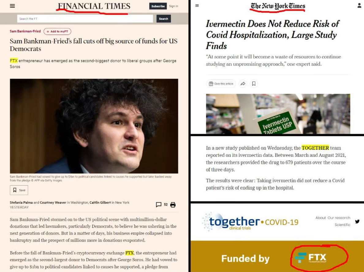 Earlier this year, the New York Times trumpeted a study that showed no benefit at all to the use of ivermectin. It was supposed to be definitive. The study was funded by FTX. Why? Why was a crypto exchange so interested in the debunking of repurposed drugs in order to drive governments and people into the use of patented pharmaceuticals, even those like remdesivir that didn’t actually work? Inquiring minds would like to know.