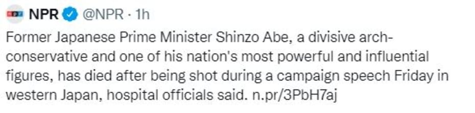 The anti-Abe pronouncement getting a lot of attention on Friday was NPR’s now-deleted tweet describing the recently murdered world leader as a “divisive arch-conservative”. In the replacement tweet, they still had the knives out as they smeared him as an “ultranationalist”.