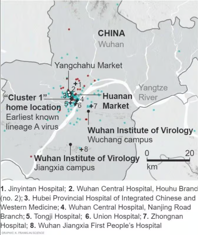 As the below map from Science magazine makes clear, the campuses of the Wuhan Institute of Virology are in fact nowhere near the area of the initial cluster of Covid-19 cases in Wuhan. The German-Chinese lab, by contrast, is right in the cluster. It is located at Union Hospital, designated by number 6 in the map. The Chinese co-sponsor of the lab, Tongji Medical College, is located virtually at the very epicentre of the outbreak: roughly one kilometre to the north of Tongji Hospital, which is designated by number 5 in the map.