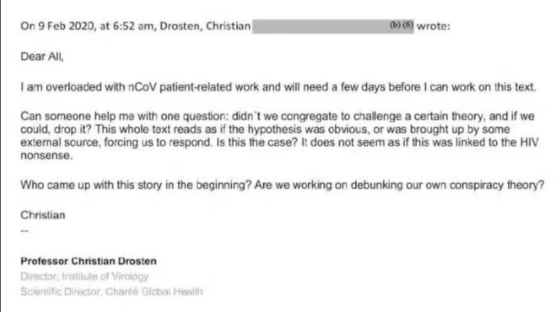 “Didn’t we congregate to challenge a certain theory and, if we could, drop it?” Christian Drosten asked with notable irritation in a terse February 9th 2020 email to the other members of the group: “Who came up with this story in the beginning? Are we working on debunking our own conspiracy theory?”