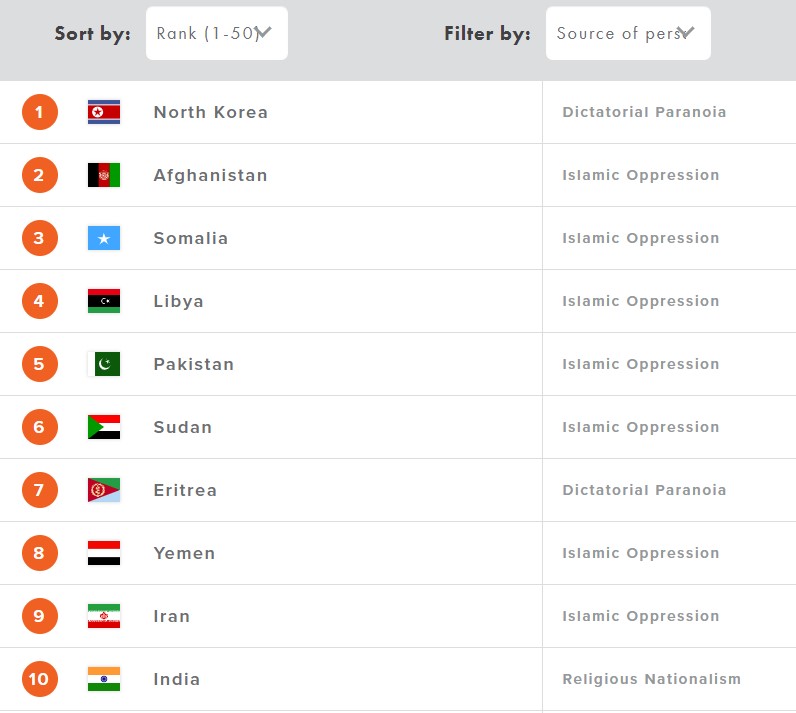 North Korea remains the No. 1 worst country for Christians, with Afghanistan coming in at second. Somalia, Libya, Pakistan, Sudan, Eritrea, Yemen, Iran, and India round out the top 10 of the Watch List’s top 50 countries.