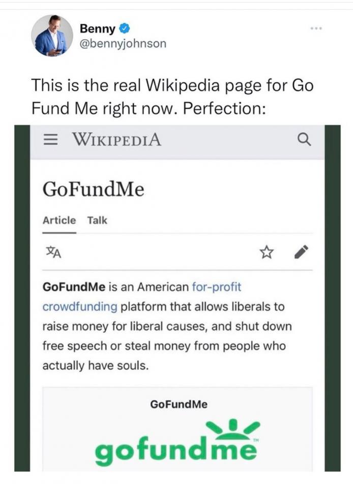 My guess is that a number of laws were breached here, along with an attempt to break the record in reaching for the moral low ground; Gofundme is nothing more than a bunch of fraudulent cowards with no principles. Incidentally, you might be interested to know the top few ’causes’ that Gofundme are running at the moment: