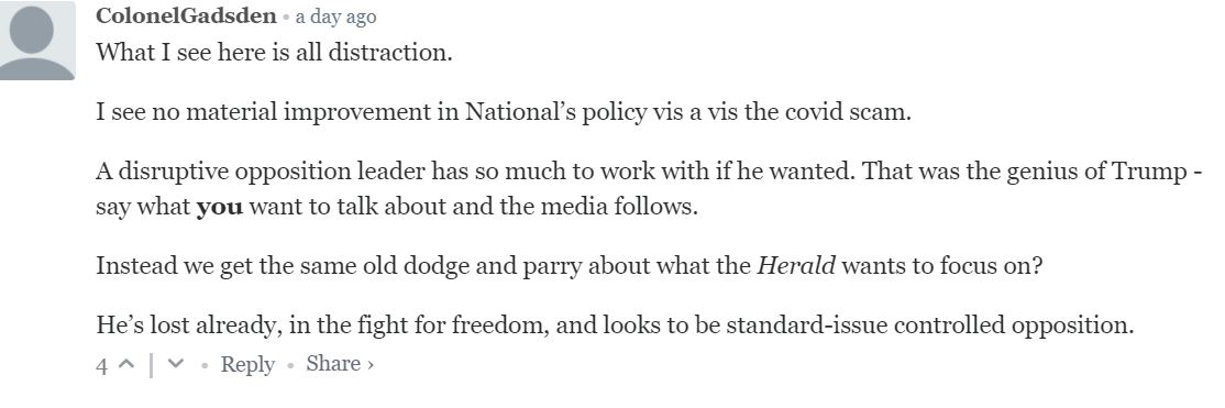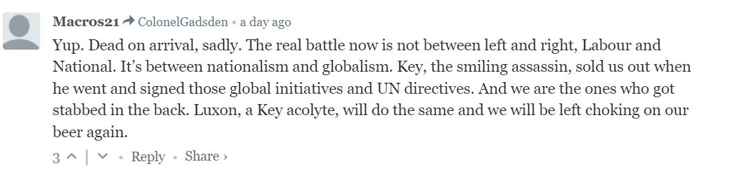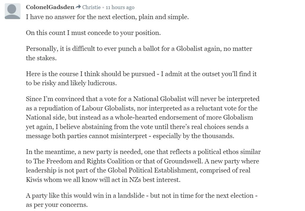 So now we have got to the heart of the matter. The commenter, and some others, want a completely new party to overthrow the current batch of globalists and give us a party, “comprised of [sic] real Kiwis whom we all know will act in NZ’s best interest”.